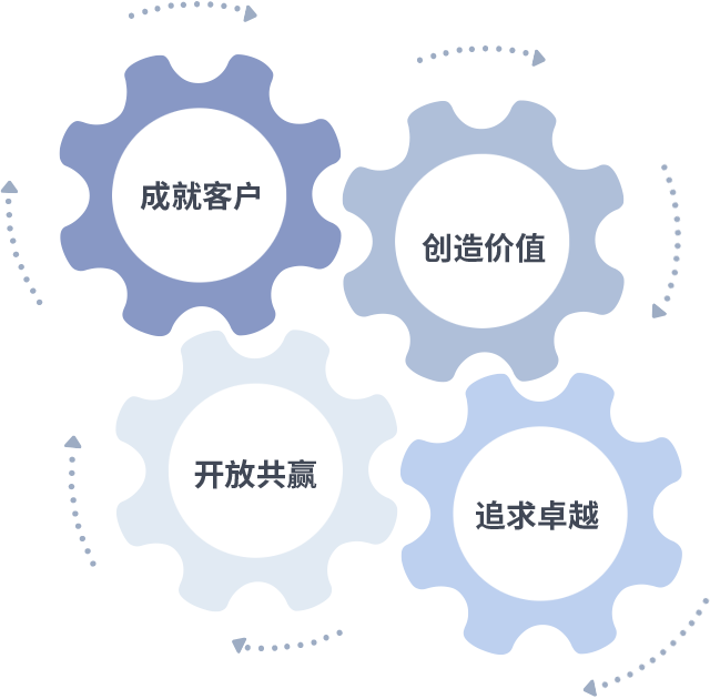 成就客户是一切决策的出发点,,创造价值是衡量所有工作的标准,,,,追求卓越是我们做事做人的态度,,,开放共赢是我们的格局也是最终的结果。。。价值观的齿轮环环相扣,,,,推动着组织里的每个人不断向前。。。。